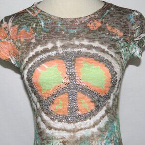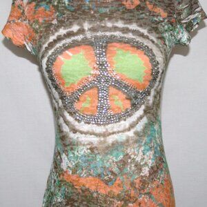 Rarely worn t-shirt made by LA Class. Lightweight, soft, semi-sheer fabric with some texture. Multi-colors include white, grey-green, blue, lime and orange. Front and back peace sign, front one is embellished with clear acrylic crystals. Cap sleeve. No fabric or size tag. Looks like a Small.