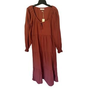 Keywords: midi dress, tiered dress, long sleeve dress, rust dress, brown dress, LA Causa, womens dress, casual dress, bohemian dress, boho dress, cottagecore dress, tie neck dress, ruffle cuff dress, new with tags