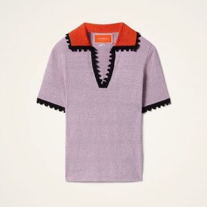 Stylish knit top with a lilac body. Features an orange collar and black trim. Perfect for a chic look.