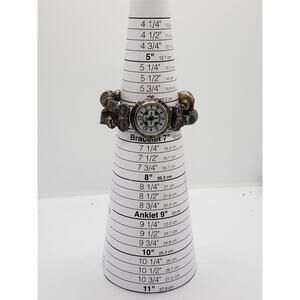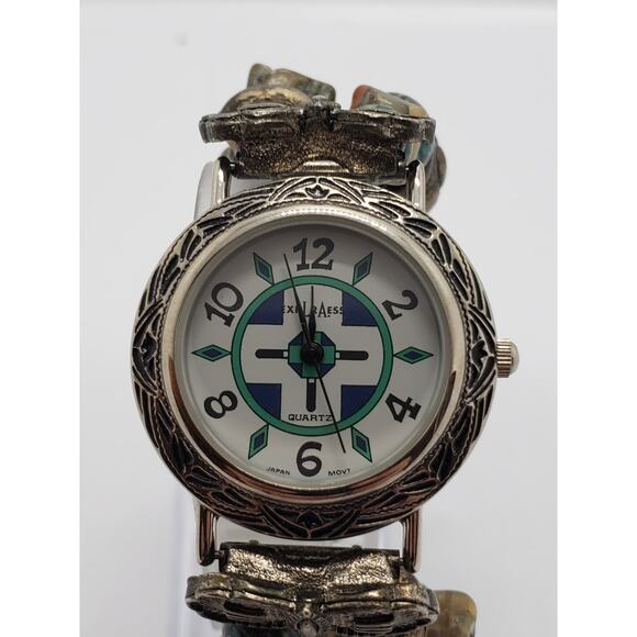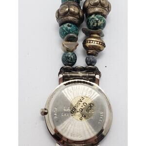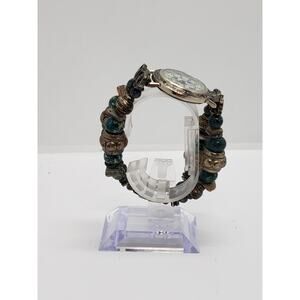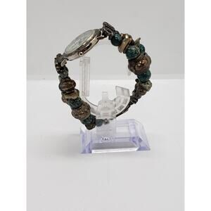 LA Express women's watch. White face with blue and green design. Black hand and numbers. Intricate bevel design. Stainless steel back. Multi colored beaded band, 7inch. Needs battery replacement.