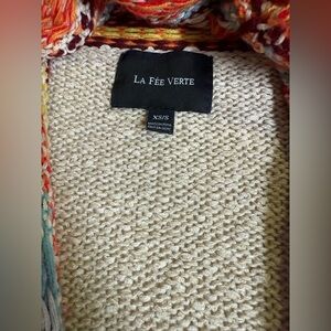 This stylish open cardigan sweater features a vibrant multicolor design with fringe detailing by LA FEE VERTE for ANTHROPOLOGIE, size XS/S. Perfect for adding a pop of color to your wardrobe.