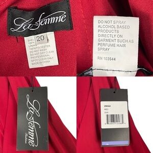 LA FEMME 29044 RED LONG SLEEVE STRETCH FAUX WRAP SURPLICE THIGH HIGH SLIT GOWN