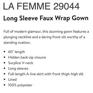 DETAIL: HIDDEN BACK ZIP CLOSURE. V-NECK AND BACK. SURPLICE TOP. LONG SLEEVES. FULL LENGTH A-LINE SKIRT WITH THIGH HIGH SLIT. LINED