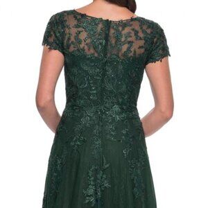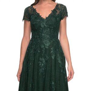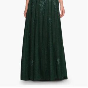 Absolutely stunning dark green A-line gown by La Femme! The dress features a beautiful lace lining with floral lace appliqué detail and delicate sequins that shimmer in the light – perfect for making an elegant statement.