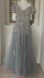 Enchanting short sleeve tulle A-line gown with V-neck and pockets. This unique gown features a stunning lace beaded applique bodice that carries into the layered skirt. Back zipper closure.