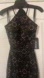 Enchanting multi-colored lace dress with sparkly gold lining and gold rhinestones. Features a high neck with thin straps and an open back. Back zipper closure.