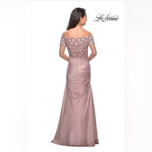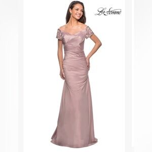 LA FEMME CHAMPAGNE WITH RUCHING SATIN FLOOR GOWN OFF THE SHOULDER STYLE 25996