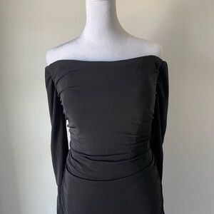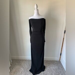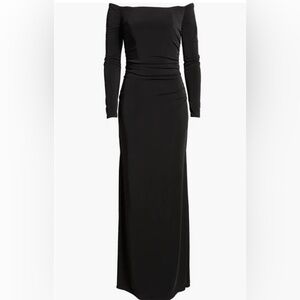 LA FEMME Long Sleeve Off The Shoulder Jersey Evening Gown
