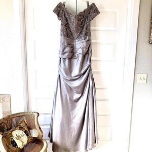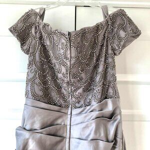 Absolutely stunning silvery pewter satin formal sheath gown with front and back ruching and jewel encrusted off-shoulder cap sleeves and back.