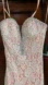 Captivating lace gown with a plunging neckline. The gown features a contrast lining and sheer beaded back straps. The gown is embellished with cascading rhinestones. Back zipper closure.