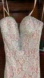 Captivating lace gown with a plunging neckline. The gown features a contrast lining and sheer beaded back straps. The gown is embellished with cascading rhinestones. Back zipper closure.