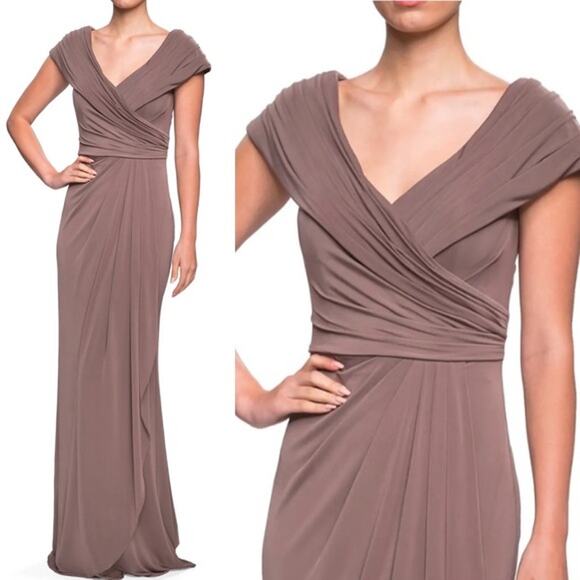LA Femme Brown Taupe Cocoa Ruched Stretch Jersey Column Gown Womens 14