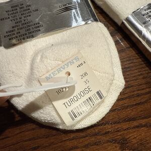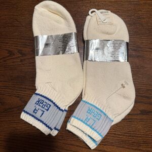 Two pairs of socks, individually wrapped one is teal with Mervyn's tag attached. The second is navy blue no tags attached. Both are brand new still wrapped with the LA gear leg wear wrapping.