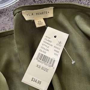LA Heart tie front satin long sleeve top. The Tie Front Satin Long Sleeve Top from our very own LA Hearts elevates your everyday style. This long-sleeve top is crafted from a piece of luxurious satin fabric and features a sweetheart neckline, a cropped fit, and a tie front with a flirty slit at the front.