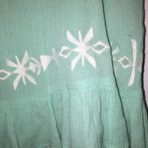 This light turquoise and white tank top gives off some serious vacation vibes. This cropped, light tank top is accented with a ruffled hem and beautiful white stitching along the front. Paired perfectly with some high waisted shorts or over your favorite bathing suit! Worn once.
