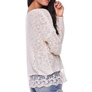Get a layered look without the added bulk! This flowy pullover sweater has long sleeves and a lace trim.