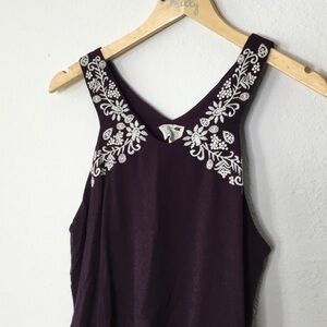 A pretty high neck, but still cut in a vcut. A beautiful floral embroidered around the top. Loose fitting, with a cut slit back. Slightly cropped.