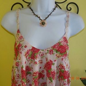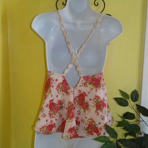 This item is used but still in good condition. LA Hearts from Pacsun Pink Floral Top in woman's size small. It's a criss cross back with crochet flowers on straps. Beautiful flowy top great for any occasion.