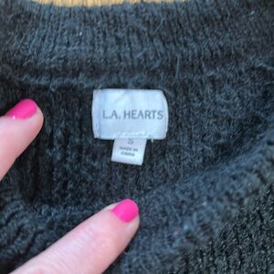 Cozy waffle knit sweater with crew neck and long sleeves. Features dropped shoulders and cropped length. Snug fit for a stylish look.