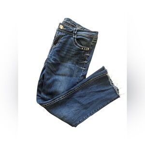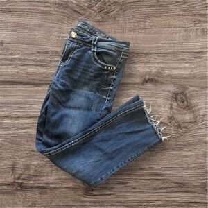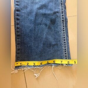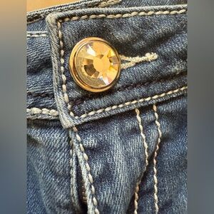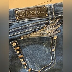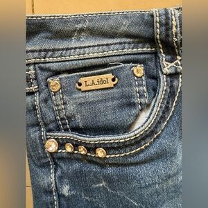 Trendy blue jeans from L.A. Idol. Perfect for everyday style. LA Idol" women's jeans, size 11, with a waist of 33 inches and an inseam of 34 inches. These bootcut jeans are made of denim with a dark wash and feature rhinestone embellishments around the front pockets and distressed detailing. The hems are frayed, and there is white stitching detail throughout, including on the back pockets. The jeans appear to be in good condition.