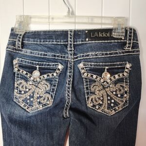 Chic boot cut jeans with stylish stitching. Rhinestone detailing. Perfect for casual wear, or dressing up.