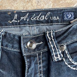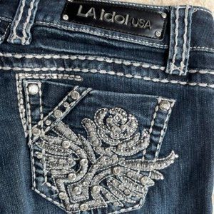 LA Idol USA Women's Embellished Bootcut Jeans - never worn! Size 9 - lots of bling! W:31, L:34. Distressed finish, color shades may vary with setting and lighting. Gorgeous rhinestones! Please review photos. No pocket flaps - slimmer look! Feel free to ask questions! Photos are of the actual jeans you will be proud to wear!