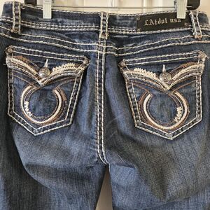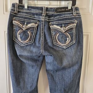 Great condition, Bling flap pockets, thick denim. Stretchy, embroidered pockets and white stitching.