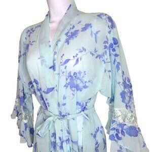 LA Intimates Knee Length Sheer Robe M Blue Lavender Floral Ruffled Lace Sleeve