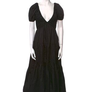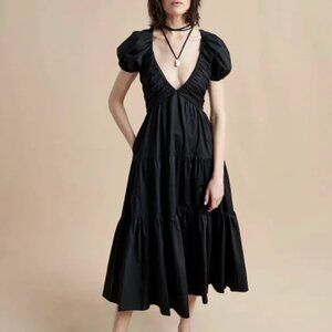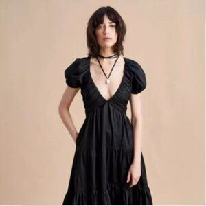 Midi contemporary, black dress with romantic puffed sleeves, tiered skirt and deep v-neck. The fabric is really nice and can be dressed up or down. Love the hidden side pockets. 100% Cotton. Excellent condition, only wore once.