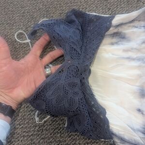 Stylish asymmetrical dresses by LA MIEL. One features a purple and white tie-dye design with lace details. The other is a vibrant red with a flowing silhouette.Designed by La Blanca.
