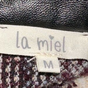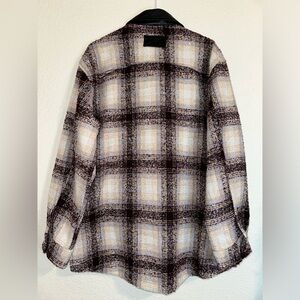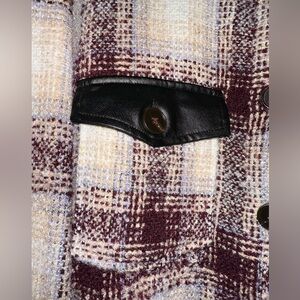 LA MIEL button down oversized flannel jacket, beautiful colors, purple tan and black faux leather 2 front pocket and 2 hip pocket