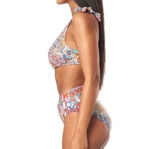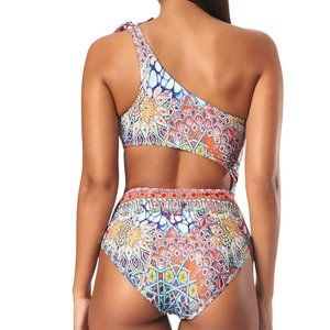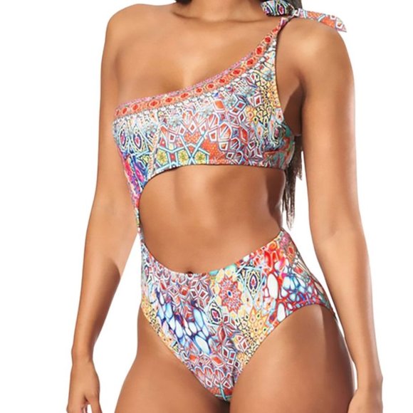 Made with a hint of stretch, this printed one-piece swimsuit has a one-shoulder neckline with a knot detail and cutout style.