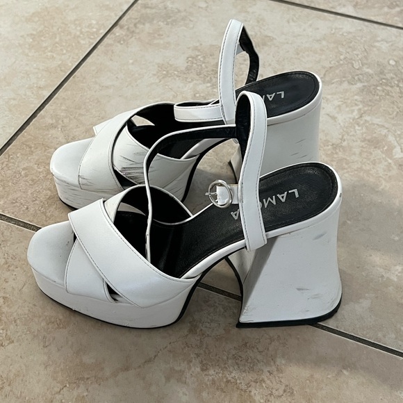 Good condition, a few marks of wear, you can easily remove them with a special leather white tint. Super comfy heel, platform style. Gives you a nice height.