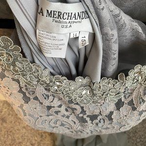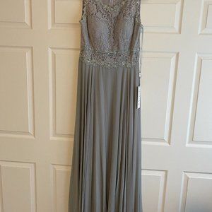 Material/Description: Floor-length evening gown. The dress is a tank top with lace at the top and a chiffon skirt. The front is a scoop neck, full coverage of the back. More intricate lace/jewel embellishments around the neck line and mid-waist.