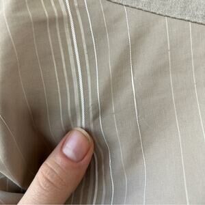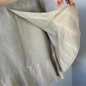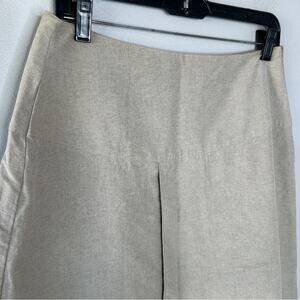 Beige/tan neutral color skirt with banded waistline, straight skirt, with tulip hemline that has lighter beige/ivory and white stripes and faux wrap front. Skirt is lined. Zips up the side.