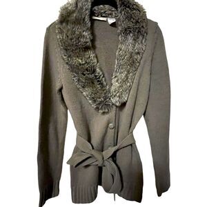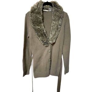 LA REDOUTE VINTAGE TAUPE WOOL BLEND CARDIGAN FAUX FUR COLLAR BELTED Y2K 2000S