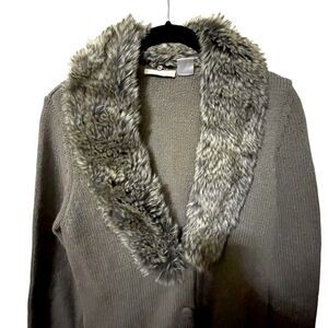 Gorgeous vintage LA REDOUTE cardigan sweater in a taupe wool blend with a removable faux fur collar. This Y2K piece channels 70s bohemian glamour with a nod to 50s elegance, making it a chic and versatile layering piece for fall and winter. Features include: Removable faux fur collar for two looks in one, Button-up front with a tie waist belt for a flattering, customizable fit, Vintage Y2K does 70s does 50s retro-inspired style. Approximate Measurements: Pit to pit: 16", Waist: 32", Hips: 36", Shoulders: 15.5", Sleeve length: 24", Total length: 26". Material: 50% Wool, 50% Acrylic; Trim 70% Acrylic, 30% Polyester. Great pre-owned condition with minimal wear. Perfect for layering over dresses, jeans, or skirts, this French-brand cardigan is a timeless and cozy statement piece that elevates any outfit.