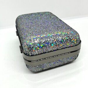 Beautiful LA REGALE RHINESTONE BOX CLUTCH EVENING BAG. A dazzling rectangular hard-case purse completely covered in shimmering silver rhinestones that catch the light with every movement. Features a sparkling rhinestone bow clasp and a gunmetal-tone chain strap that can be worn crossbody or tucked inside for a sleek handheld look. Measures approximately 5" wide x 3.25" high x 2" deep with a 23" drop chain strap. Fully lined black interior. Snap closure works securely. Label inside reads La Regale.