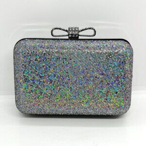 LA REGALE RHINESTONE BOW CLUTCH EVENING BAG SILVER METALLIC BOX PURSE W CHAIN
