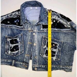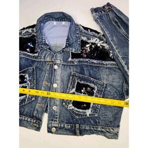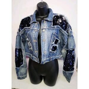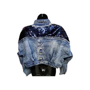 The LA ROS sequence jean jacket is a designer women's jacket in size XL with a 43" bust. Made from cotton denim in a vibrant blue color, this button-up jacket features a unique accented design with sequins. Perfect for casual occasions, this breathable jacket is a stylish and comfortable addition to any woman's wardrobe. The one-size fit makes it versatile for a wide range of body types, while the regular size type ensures a comfortable and flattering fit.