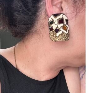 Vintage La Rage modernist textured clip on earrings with enamel like paint designs. Bold and stunning look.
