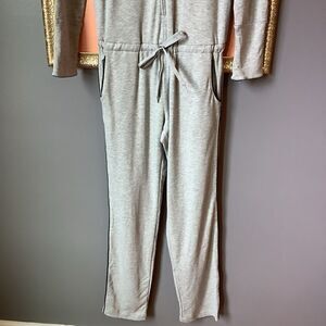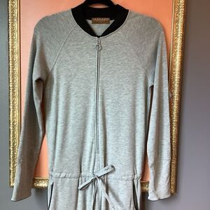 Gray, track style, jumpsuit in modal, cotton and spandex. Extra soft and comfy for those days you just want to relax but still have a vibe. Light gray fabric with black piping and black collar. Pockets. Drawstring waist. Zips up front. Just add kicks! Size small.