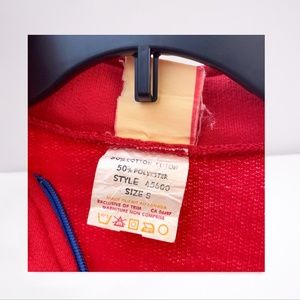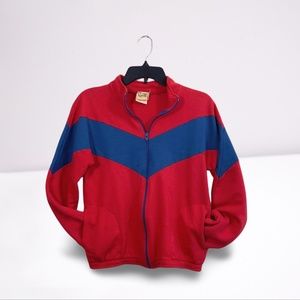 Vintage Track Jacket, Red and Blue Chevron Pattern Jacket this is a rare brand from the 1970s / 1980s. It is an Olympic Style Track Jacket with hand warmer pockets. Blue YKK Zipper details make this a far out 'fit. Small zippered collar. Bottom of the jacket and cuffs are lined with elastic. In excellent condition, no holes or stains, no pulls.