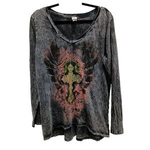L.A Teez Womens Embellished Cross Top 2X Black Washed Long Sleeve Grunge