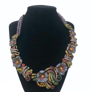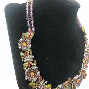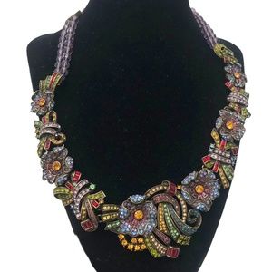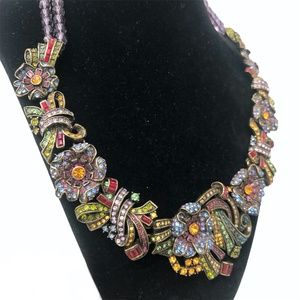 Vintage LaVintage bib floral multicolored bib crystal flower necklace in excellent preowned condition and in original packaging. I don't think it was ever worn. Bronze tone setting with flowers in shades of purple and blue. The crystal ribbons around the flowers are green, yellow, red, pink, purple, and blue. The back of the necklace has purple beads and some purple crystals on the bronze tone clasp. This is a statement necklace!