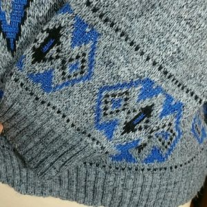Awesome Dude! 80'S vintage unisex sweater LA VISTA BRAND.Made in USA . Drop shoulder .Slight cowl neck.VERY COOL. GREAT CONDITION! 22"IN CHEST PIT TO PIT.19"IN SLEEVE FROM DROP SHOULDER SEAM.27"IN FROM NECK TO BOTTOM .18"IN ACROSS BOTTOM . Made of 100% Creslan acrylic. Machine wash.Grey with flecks of black. Black with bright blue accents.