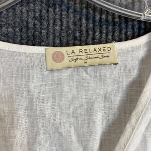 100 linen. Gorgeous top! Just doesn’t fit me well. Would be best for a small.