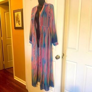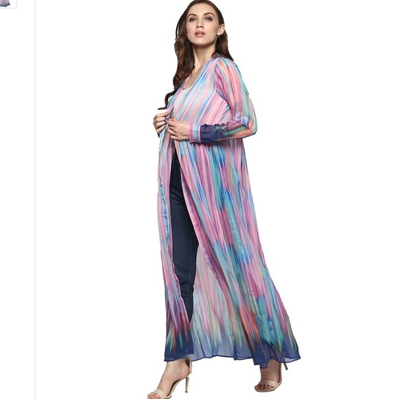 One of India’s most respected designers. Unique open front, vertical striped, pastel colored long shrug with a full cuffed sleeve.