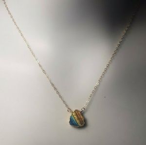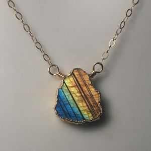 Beautiful, genuine, polished, Labradorite Crystal necklace. This gorgeous 18K electroplated Labradorite crystal is set stationary onto approx an 18- 19" genuine 14K yellow gold filled chain. NOT PLATED. It is not adjustable. This polished Labradorite Gem measures approx 15mm(L) x 12mm(W) x 3mm (H). Natural Labradorite crystal with natural flaws only. This stunning crystal has flash. See pics for exact item. Pics show both sides.