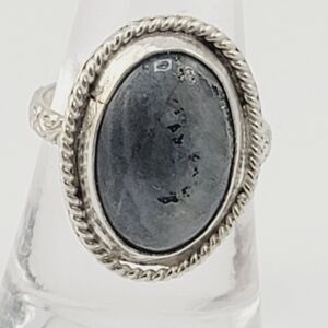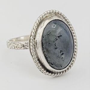 LABRADORITE ROUND RING WITH EMBOSSED RING BAND HANDMADE IN STERLING SILVER 8.5